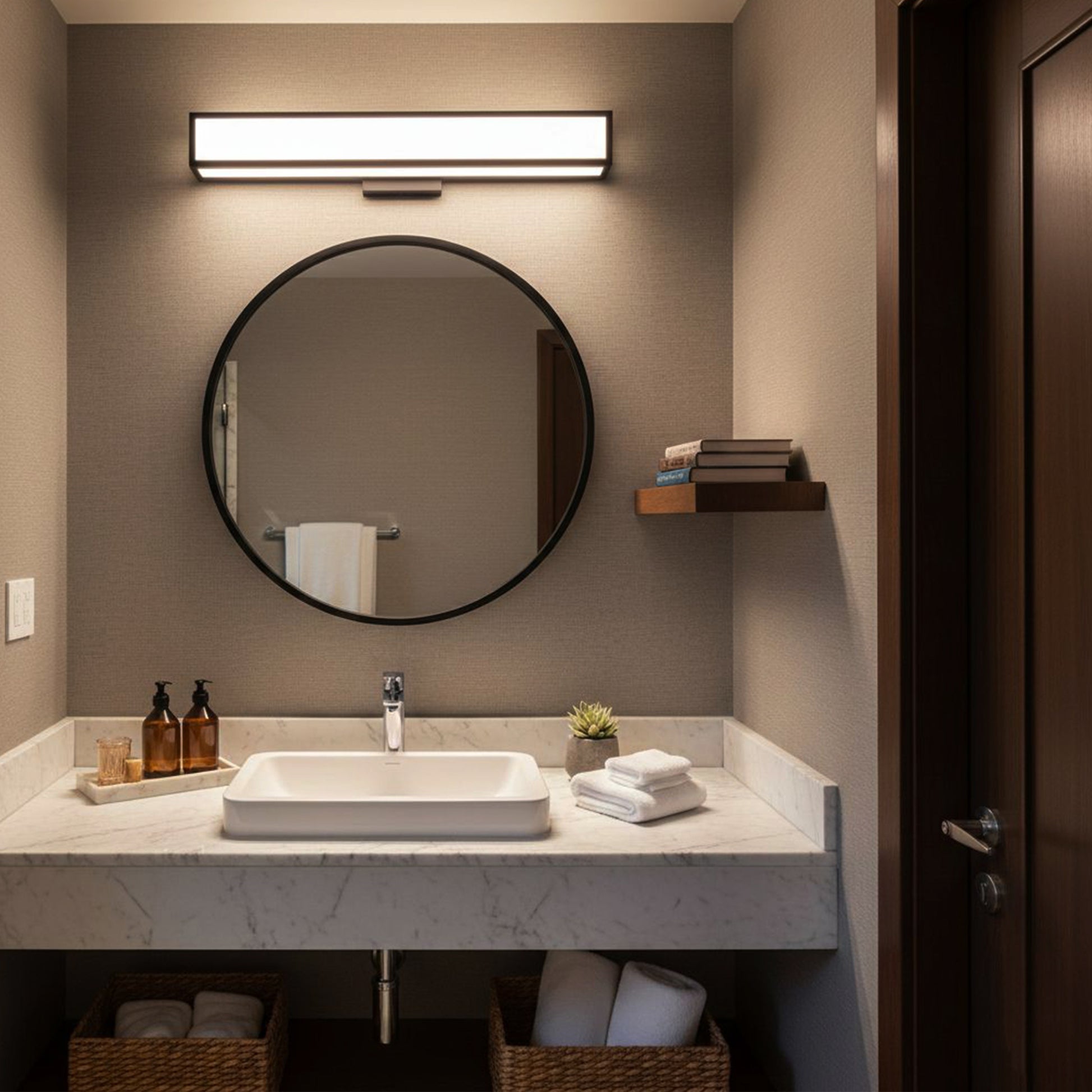 - Slim 24″ Profile fits easily above standard vanities without taking up extra wall space.