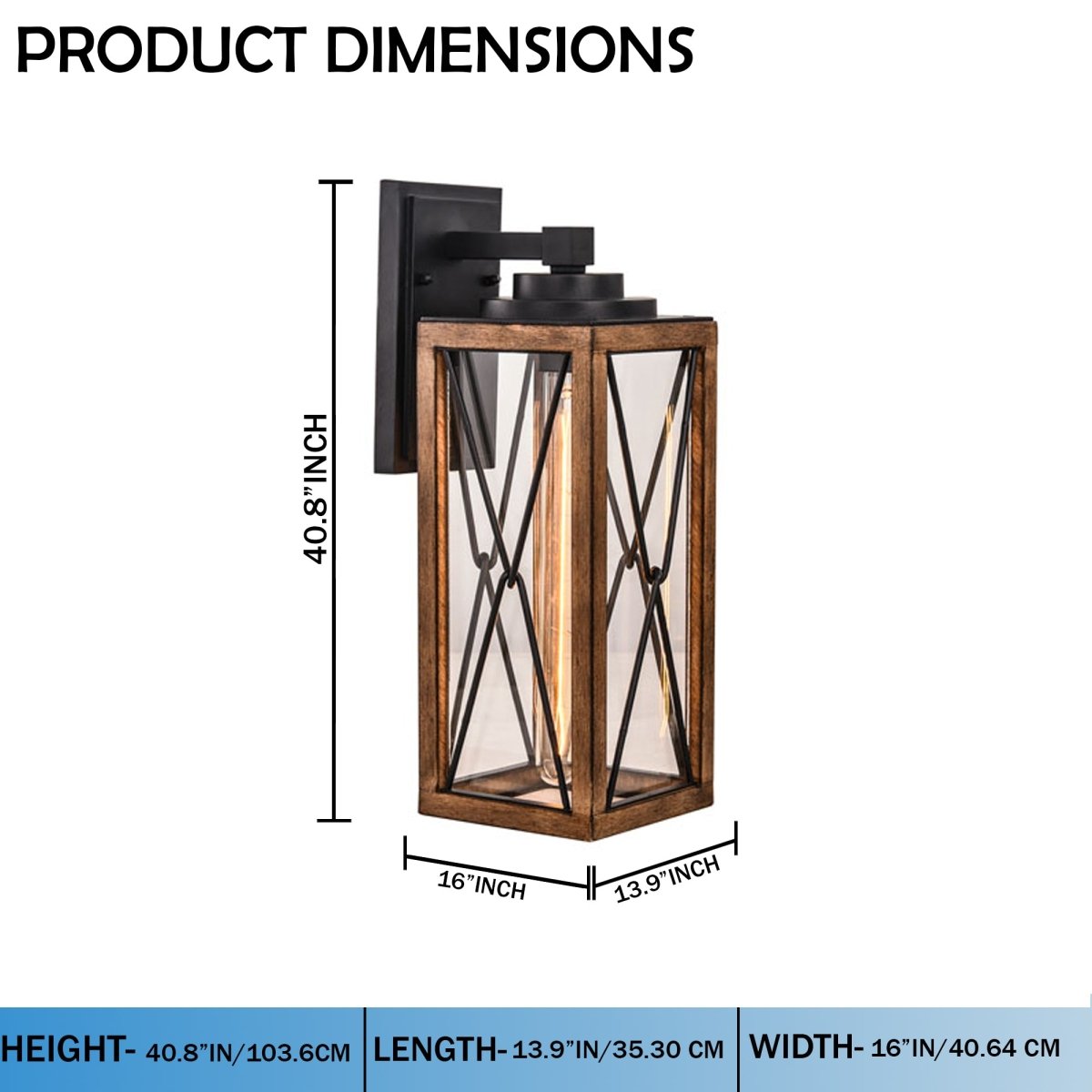 Enhance your outdoor spaces with the Outdoor Wall Lantern, standing 16" high and designed to withstand the elements. This waterproof exterior wall light features an anti-rust finish, ensuring durability and longevity. Ideal for front porches, garage door-ways, and entryways, it combines style and functionality. The wall mount lamp provides bright and even illumination, making it a perfect addition to your home's exterior decor. Easy to install, it adds a touch of style to any outdoor setting while ensuring reliable performance.